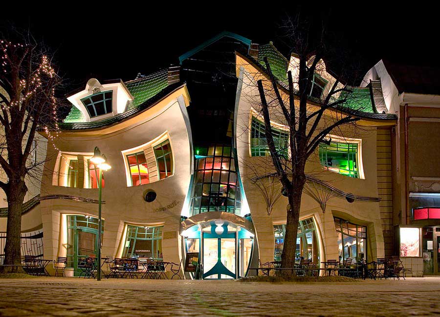 خانه ی کج در شهر Sopot لهستان واقع شده و سازه ای بی نهایت عجیب و جالب دارد. این خانه در سال ۲۰۰۳ بر اساس طرحی از عکس های Jan Marcin Szancer و Per Dahlberg ساخته شد و شکل آن به گونه ای است که به نظر می رسد از یک کارتون برداشت شده باشد. طراحی این خانه کج است اما کج از نوع متناسب و متقارن! بنابراین می توان گفت که این ساختمان اصلا زشت نیست تنها با ساختمان های دیگر فرق داشته و عجیب است. نکته ی جالب اینجاست که سازندگان چگونه توانستند چنین ایده ی نبوغ آمیزی را به واقعیت تبدیل کنند، اما در هر صورت این خانه واقعی است و همه خلاقیت آن را تحسین می کنند.